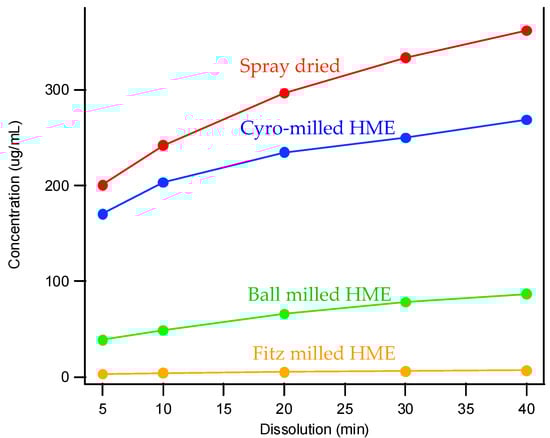 Several different approaches have been used to make amorphous solid dispersions, including hot melt extrusion, spray drying, spray congealing, and co-precipitation [,,,,,]. The two most commonly used approaches in the pharmaceutical industry are hot melt extrusion and spray drying. A typical spray-drying process involves atomization of a solution containing an active pharmaceutical ingredient (API) and polymer into a spray of droplets of micron sizes. This is followed by rapid evaporation of solvent from the droplets upon contact with heated processing gas (typically air or nitrogen) in a drying chamber. The formation of dry particles proceeds under controlled temperature and airflow conditions [,]. Hot melt extrusion is another robust and continuous process to produce molecular dispersions of drugs into a polymer matrix. During this process, a powder or granule mixture of polymeric components and active substances, including any additives or plasticizers, are blended, melted, and extruded through an orifice or die under controlled temperature, pressure, feed rate, and screw speed []. The resultant extrudate is milled to an appropriate particle size for further formulation processing.