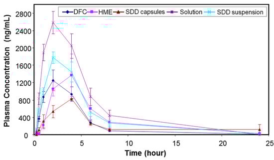 All the in vitro performance results indicated that the spray-drying process with 25% drug load HPMCAS-MF would be a viable option to achieve a higher relative solubility and maintain acceptable chemical and physical stability. On the other hand, the hot melt extrusion process generated higher impurity levels, but also reached higher supersaturation. Thus, both spray-dried and hot melt extrusion HPMCAS-MF-based formulations with 25% drug load were tested in a dog model to assess their in vivo performance. For comparison, a solution (MK-A HCl salt in 10% tween 80), a spray-dried suspension, and a simple dry-blend of HCl salt with commonly used excipients, such as microcrystalline cellulose, lactose, and crospovidone (DFC), were also dosed into the dog model as control formulations. Table 5 summarizes the mean pharmacokinetic parameters after administration of the above formulations to pentagastrin-pretreated male Beagle dogs at 15 mg/kg dose (n = 3 or 6). The purpose of pentagastrin pretreatment is to lower the dogs’ gastric pH to ~2 for 1 h to simulate human gastric pH []. Profiles of mean plasma concentration versus time are shown in Figure 5.