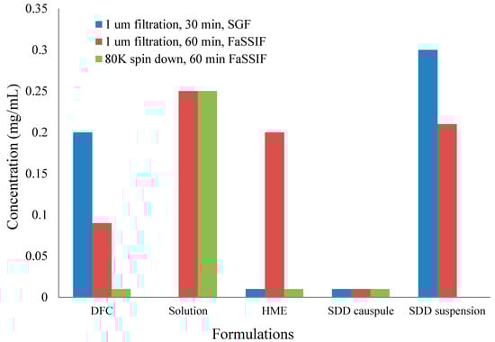1-μm filtration and 80 K ultracentrifugation results of two-stage dissolution of different formulations. FaSSIF, fasted state simulated intestinal fluid.