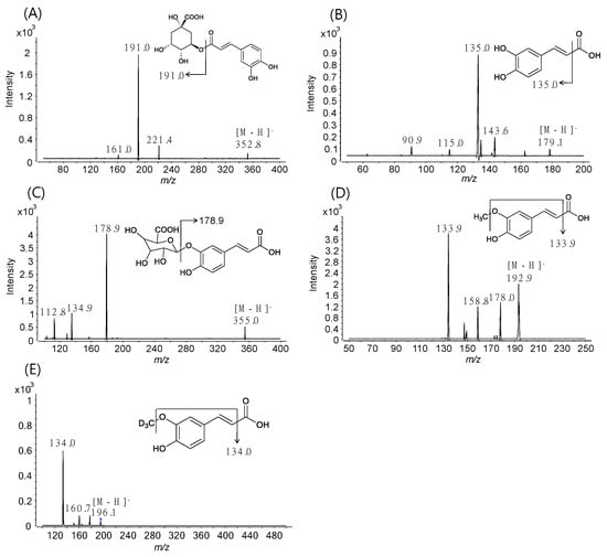 Product ion spectra of (A) chlorogenic acid (CGA), (B) caffeic acid (CA), (C) CA-3-G, (D) ferulic acid (FA), and (E) FA-d3 (IS).