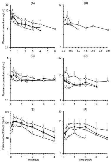Pharmacokinetic parameters were analyzed while using noncompartment analysis (WinNonlin, Pharsight, Mountain View, CA, USA), including the area under the plasma concentration-time curve during the period of observation (AUClast), the terminal half-life (t1/2), and mean residence time (MRT). The peak plasma concentration (Cmax) and the time to reach Cmax (Tmax) were directly obtained from the experimental data. All data are expressed as the means ± standard deviations (S.D.).