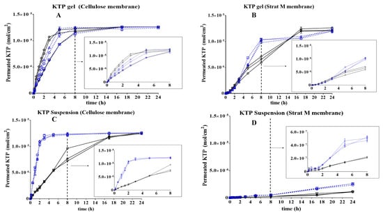 Permeation profiles of ketoprofen (KTP) for 24 h in different conditions of matrix, medium, pH and type of membrane. (A) KTP Gel-cellulose membrane, (B) KTP Gel—Strat M® membrane, (C) KTP Suspension—cellulose membrane, (D) KTP Suspension—Strat M® membrane. Graph legends: ◯ = Cell A. pH: 5.6; ☐ = Cell B. pH: 5.6; △ = Cell C. pH: 5.6; ▽ = Cell A. pH: 7.4; ◇ = Cell B. pH: 7.4;