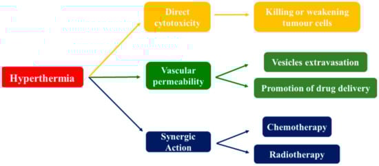 Hyperthermia is defined as the procedure of raising the temperature of the tumour tissue to 40–43 °C, and it has been used in the treatment of several diseases, including cancer, showing many therapeutic benefits, as illustrated in Figure 1 [9].