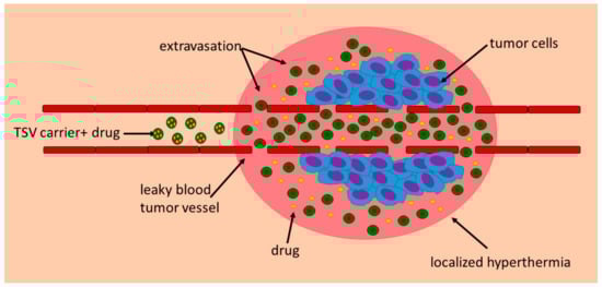An ideal thermo-responsive nanodevice should be obtained by materials that are safe and sensitive enough to respond to temperature changes between 39 °C and 42 °C. Furthermore, the device may be able to sequester a drug until it reaches the tumour site, where hyperthermia can promote carrier extravasation and a localized triggered release, ensuring minimal drug exposure for normal tissue (Figure 2) [14].