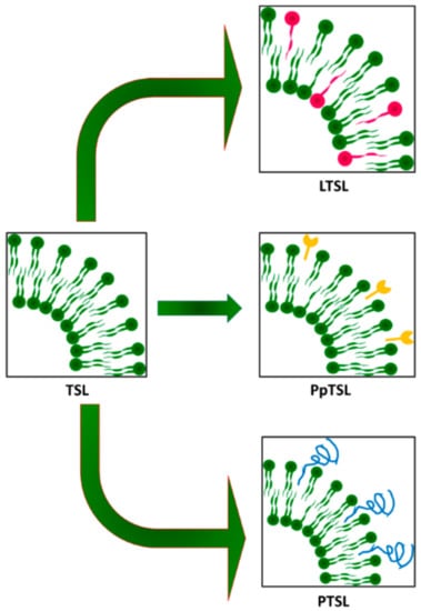 Schematic representation of different thermo-sensitive liposome (TSL) systems: lysolipids thermo-sensitive liposomes (LTSL), peptides thermo-sensitive liposomes (PpTSL), polymer thermo-sensitive liposomes (PTSL).