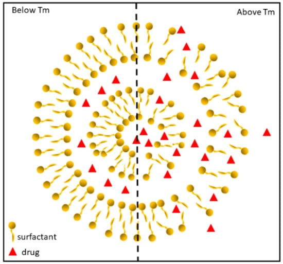 Traditional thermo-sensitive vesicles are composed of lipids or non-ionic surfactants that undergo a gel-to-liquid phase transition slightly above 37 °C, whereas more recently, temperature-sensitization of nanosized carriers has been demonstrated with the use of lysolipids and synthetic temperature-sensitive polymers, as illustrated in Figure 3 and extensively explored in the following section [18].