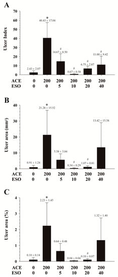 Aceclofenac (ACE) 200 mg/kg-induced gastric ulcers represented by (A) ulcer index, (B) ulcer area (mm2), and (C) relative ulcer area (%) in the absence or in the presence of pre-treatments with esomeprazole (ESO) 0, 5, 10, 20, 40 mg/kg in rats. Each column represents the mean ± SD. *, p < 0.05 vs. control (ACE = 0/ESO = 0 mg/kg); #, p < 0.05 vs. ACE = 200/ESO = 0 mg/kg.