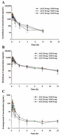 Average plasma concentration-time profiles of (A) aceclofenac, (B) diclofenac, and (C) esomeprazole following oral administration of aceclofenac (20 mg/kg) in combination with esomeprazole (0, 4, 8 mg/kg) in rats. Data represent mean ± SD (n = 4–6).