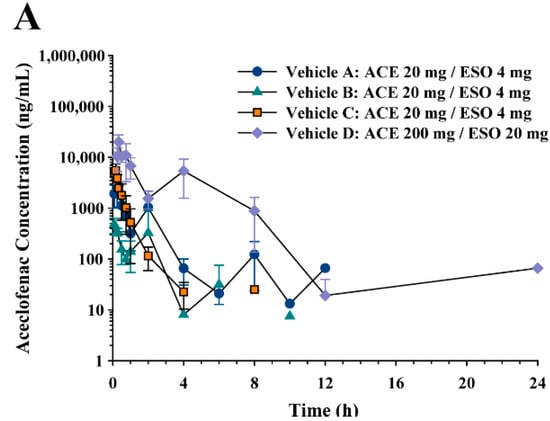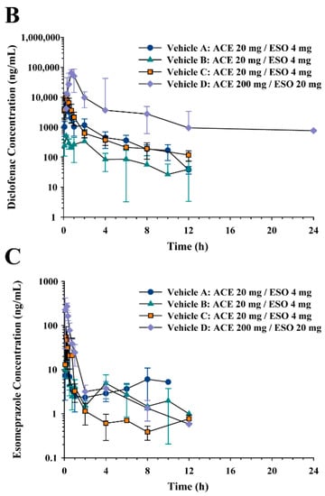 Average plasma concentration-time profiles of (A) aceclofenac, (B) diclofenac, and (C) esomeprazole following oral administration of vehicle A, B, C, and D containing aceclofenac (20 mg/kg for A, B, and C and 200 mg/kg for D) and esomeprazole (4 mg/kg for A, B, and C and 20 mg/kg for D) in rats.