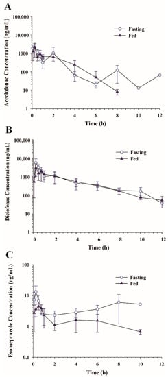 To evaluate food effects on aceclofenac and esomeprazole pharmacokinetics, aceclofenac (20 mg/kg) and esomeprazole (4 mg/kg) prepared in vehicle A were orally administered in fasting and fed conditions. Plasma concentration vs. time profiles of aceclofenac, diclofenac, and esomeprazole are shown in Figure 4. Non-compartmental pharmacokinetic parameters of aceclofenac, diclofenac, and esomeprazole in fasting and fed conditions are summarized in Table 3. Although overall plasma concentration vs. time profiles of aceclofenac and diclofenac were similar between fasting and fed conditions (Figure 4A,B), a longer t1/2 was observed in fasting conditions for aceclofenac. In contrast, there was no significant difference between the t1/2 in the fasting and fed conditions for diclofenac (Table 3). Conversely, overall esomeprazole plasma concentrations were lower in the fed condition than in the fasting condition (Figure 4C). The t1/2 was longer and Cmax and AUCall were significantly lower for esomeprazole in the fed condition (Table 3).