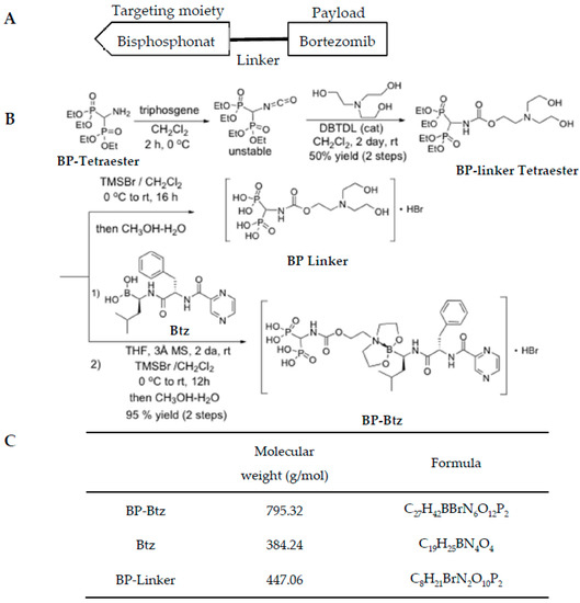 Generation of Bisphosphonate-Bortezomib (BP-Btz) conjugate. (A) Diagram showing the principle of our bone targeting strategy, including a bisphosphonate, a linker, and a payload that usually is a drug or other pharmacological inhibitor. (B) Steps of the BP-Btz synthesis. (C) Molecular weight and chemical formulation of BP-Btz, Btz or BP-linker.