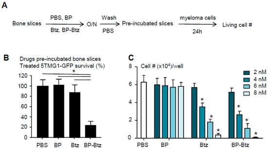 BP-Btz binds to bone matrix and maintains its bioactivity to kill myeloma cells. (A) Diagram showing the bone binding assay. (B) Bone slices were pre-incubated with PBS, Btz, BP-Btz overnight and then washed with PBS. 5TGM1-GFP myeloma cells were cultured with bone slices for 24 h and cells survival was measured using a Cell Counting Kit-8. Data are means ± SD of 6 wells. 3 experimental repeats. One way ANOVA with Dunnett’s test. * p < 0.05. (C) Cells were treated with different doses of drugs for 24 h. The number of living cells was counted using a Trypan Blue exclusion method. Data are means + SD. N = 4 wells. 3 experimental repeats. One way ANOVA with Dunnett’s test. * p < 0.05 vs. PBS.