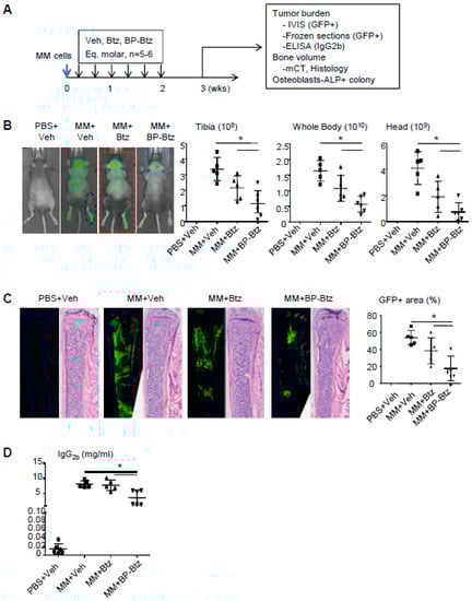 BP-Btz reduces tumor burden in a mouse model of MM. (A) Mice injected with 5TGM1-GFP cells were treated with Veh, Btz, or BP-Btz for 2 weeks and subjected to outcome measures 1 week post-treatment. (B) Distribution and signal intensity of GFP+ cells by IVIS imaging. (C) GFP+ area on frozen sections of femoral bone. (D) Serum levels of mouse IgG2b by ELISA. Data are means ±SD of 5–6 mice. One way ANOVA with Dunnett’s test for comparison of MM + Veh, MM + Btz, and MM + BP-Btz groups. * p < 0.05.