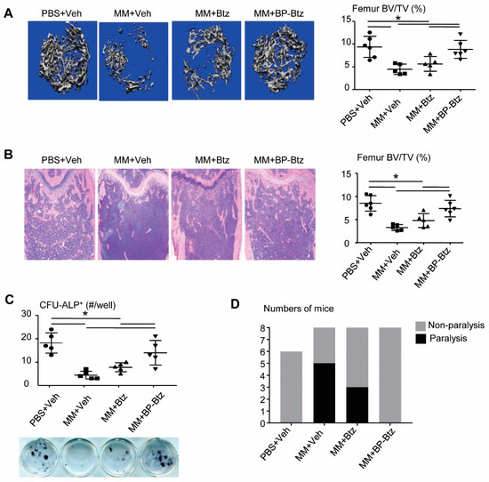 BP-Btz reduces bone loss and osteoblast inhibition in a mouse model of MM. Mice were described in Figure 3A. (A) Micro-CT images and data analysis of femoral bones. (B) Images of H&E-stained sections and femoral bone volume by histomorphometric analysis. (C) BM cells were cultured in the OB-inducing medium for 12 days. CFU-ALP+ colonies were identified by ALP staining. Data are means ± SD of 5–6 mice. One way ANOVA with Dunnett’s test for comparison of PBS + Veh, MM + Veh, MM + Btz, and MM + BP-Btz groups. * p < 0.05. (D) Number of paralyzed mice in each group.