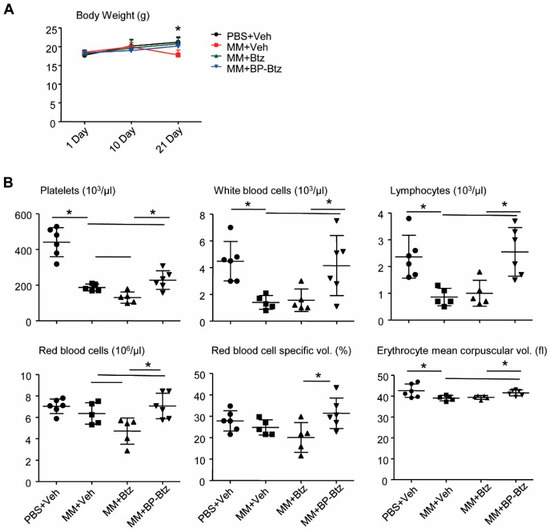 BP-Btz causes less severe pancytopenia in MM mice than Btz. Mice described in Figure 3A were used. (A) Body weight. (B) Routine blood testing was performed. Data are means ± SD of 5–6 mice. One way ANOVA with Dunnett’s test for comparison of PBS + Veh, MM + Veh, MM + Btz, and MM + BP-Btz groups. * p < 0.05.