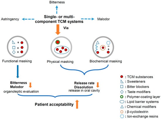 Three types of taste-masking techniques (i.e., functional masking, physical masking, and biochemical masking) have been applied to conceal the unpleasant taste and/or odor of TCM-derived substances with some success. Among them, biochemical masking is mainly used for bioactive TCM-derived ingredients, while the others are suitable for both single TCM ingredients and multicomponent TCM systems.