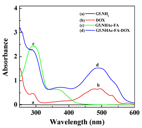 UV-vis spectra of G5.NH2 dendrimers, DOX·HCl, G5.NHAc-FA dendrimers, and G5.NHAc-FA-DOX conjugates in aqueous solution.