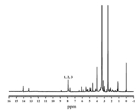 To link DOX to the surface of G5 PAMAM dendrimers via a pH-responsive linker, we first prepared CA-DOX by reacting the amine group of DOX with cis-aconitic anhydride (Scheme 1a). The structure of CA-DOX was identified by 1H NMR (Figure 2). 1H NMR spectrum shows that the emergence of two peaks at 6.47 ppm and 14 ppm is related to the protons of =CH–CO– and carboxyl groups of the cis-aconitic anhydride linkage, respectively. The aromatic proton peaks can be attributed to the characteristic DOX proton peaks (peaks 1–3), which is in a good agreement with the literature [49]. The successful synthesis of CA-DOX was further characterized by FTIR spectroscopy (Figure S2, Supplementary Materials). In comparison with the FTIR spectrum of DOX, CA-DOX shows a broad band stretching across 3000 cm-1, which is assigned to the formation of the –COOH group for the cis-aconitic anhydride linkage. CA-DOX was also characterized by HPLC (Figure S3, Supplementary Materials). The retention time of DOX is 11 min, while the retention time of CA-DOX is 4.6 min, and still a small portion of unreacted DOX was observed after purification.