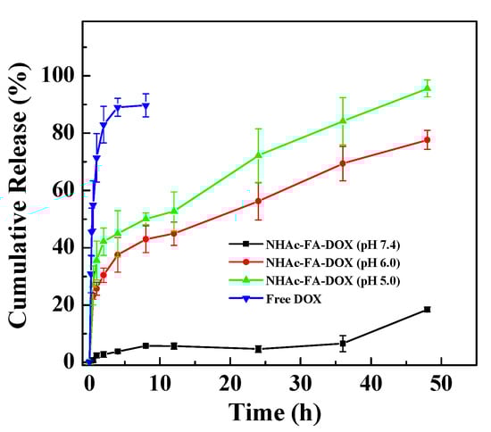 Folic acid (FA)-linked therapeutic agents have been commonly used for selectively delivering drugs to cancer tissues expressing folate receptors (FAR) [4,5,6], which have been found to be overexpressed in many types of tumors [7,8], such as colon carcinoma, epidermoid carcinoma (KB), and ovarian carcinoma. Upon binding of FA ligands with FAR expressed onto the surface of cancer cells with a high affinity, the nanocarriers linked with FA can be subsequently internalized into cancer cells through the receptor-mediated endocytosis process and release the therapeutic agents to cancer cells in a specific manner [4,9,10,11]. Among the stimuli investigated for anticancer drug delivery, such as pH [12], temperature [13], and redox [14], pH has been usually investigated to trigger the drug release, since in solid tumors, the extracellular pH is more acidic (~6.5) than the physiological pH (~7.4) of normal tissue due to the irregular angiogenesis [15]. Regarding the applications of acid-triggered drug release, acid-sensitive linkage systems such as hydrazone bond [16,17] and cis-aconityl linkage [18,19] have been studied to design the stimuli-responsive drug delivery systems. For example, Chytil P. et al. [20] conjugated doxorubicin (DOX) to N-(2-hydroxypropyl) methacrylamide (HPMA) copolymers via a hydrazone bond, and demonstrated an enhanced anticancer activity of DOX in vitro and in vivo.