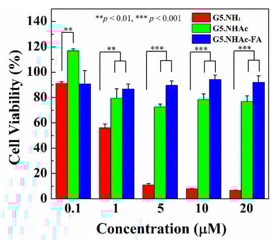 The viability of KB cells treated with G5.NH2, G5.NHAc, and G5.NHAc-FA dendrimers at different concentrations.