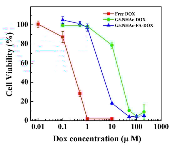 To evaluate the pharmacological activity of dendrimer-DOX conjugates, in vitro MTT cytotoxicity tests against KB cells were performed. The cytotoxicity of G5 PAMAM dendrimers and modified dendrimers (G5.NH2, G5.NHAc, and G5.NHAc-FA) were determined prior to the cytotoxicity tests of dendrimer-DOX conjugates. Figure 4 shows the viability of KB cells treated with G5.NH2, G5.NHAc and G5.NHAc-FA dendrimers at different concentrations. When the concentration of G5.NH2 was increased to 1 μM, the viability of KB cells was as low as 55%, and the cells reached a viability of approximately 10% at a dendrimer concentration of 5 μM, indicating the cytotoxicity of G5.NH2 dendrimers, similar to our previous work [52]. In contrast, the cell viability remains more than 80% after the cells were treated by both modified dendrimers (G5.NHAc and G5.NHAc-FA) at a concentration of 1 μM. No significant cytotoxicity was observed when the concentration of modified dendrimers reached up to 20 μM, indicating that the dendrimer toxicity can be significantly alleviated after surface acetylation modification.