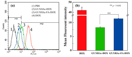 Flow cytometry assay was carried out to analyze the cellular uptake of dendrimer-DOX conjugates by KB cells by detecting the fluorescence intensity of cells after incubation with G5.NHAc-DOX and G5.NHAc-FA-DOX with a DOX concentration of 40 µM for 2.5 h at 37 °C. Free DOX at a concentration of 10 μM was also tested for comparison. As shown in Figure 6a, a significant increase in cell fluorescence was observed after KB cells were treated with free DOX and dendrimer-DOX conjugates. In general, the fluorescent intensity of free DOX is higher than that of the dendrimer-DOX conjugates even though the tested concentration of free DOX is lower than that of DOX in dendrimer-DOX conjugates. This suggests that the uptake of free DOX is faster than that of dendrimer-DOX conjugates by KB cells. It should also be noted that the cellular uptake of G5.NHAc-FA-DOX conjugate was remarkably higher than that of G5.NHAc-DOX conjugates (p < 0.01, Figure 6b), which means that FA-mediated binding process was involved in the cellular uptake of G5.NHA-FA-DOX. The higher cellular uptake of G5.NHA-FA-DOX could also explain the higher cytotoxicity of G5.NHA-FA-DOX vs. G5.NHAc-DOX (Figure 5). Taken together, the flow cytometry study strongly reveals that the introduction of FA moiety to the surface of dendrimers allows for specific targeting of KB cells overexpressing FAR.