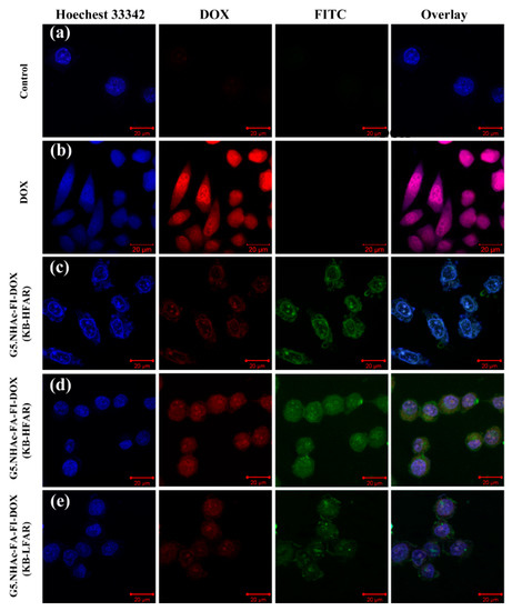 Confocal laser scanning microscopic images of KB cells having high-level of FAR expression (KB-HFAR) cells treated with (a) PBS, (b) free DOX (10 µM), (c) G5.NHAc-FI-DOX (40 µM DOX-equiv.), (d) G5.NHAc-FA-FI-DOX (40 µM DOX-equiv.), and (e) KB cells having low-level of FAR expression (KB-LFAR) cells treated with G5.NHAc-FA-FI-DOX (40 µM DOX-equiv.).
