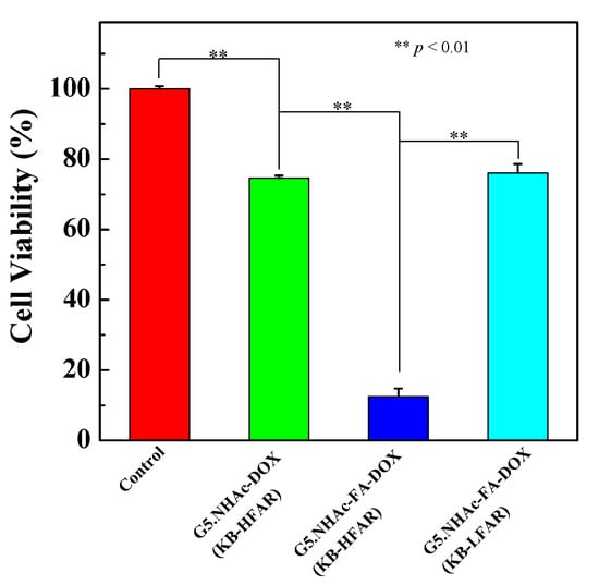 The targeted inhibition effect of FA-modified dendrimer-DOX conjugates on FAR-overexpressing KB cells was verified by the MTT assay. Figure 8 shows the viability of KB-HFAR and KB-LFAR cells treated with dendrimer-DOX conjugates. The incubation of KB-HFAR cells with the G5.NHAc-FA-DOX conjugates caused a significant loss (87.6%) of cell viability (p < 0.01 vs. control). In contrast, KB-LFAR cells displayed a viability of 76.1% after the same treatment with the G5.NHAc-FA-DOX conjugate. It should also be noted that KB-HFAR cells only lost 25.4% of viability after the treatment with G5.NHAc-DOX conjugates. Taken together, the results fully imply that the G5.NHAc-FA-DOX conjugates enable a specific targeted inhibition of cancer cells via FAR-mediated endocytosis.
