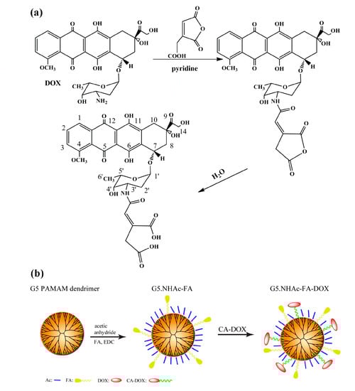 Schematic illustration of the synthesis of (a) Cis-Aconityl-Doxorubicin (CA-DOX) and (b) G5.NHAc-FA-DOX conjugates. FA: folic acid; DOX: doxorubicin.