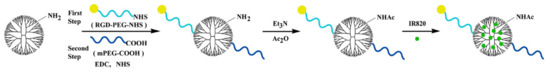 G5.NH2 dendrimers were functionalized successively by RGD peptide, PEG chain, and acetyl groups according to the references, with some modifications [43,46]. Firstly, RGD-SH dissolved in DMSO was mixed with MAL-PEG-NHS of equivalent molar ratio. After reaction for 24 h, the products were purified by dialysis against DI water. Then, the obtained RGD-PEG-NHS was added into the G5.NH2 DMSO solution with the RGD/G5.NH2 molar ratio at 6/1. After 24 h reaction, mPEG-COOH that was pre-activated by 5-fold equivalent molar of EDC and NHS was added into the mixture, followed by stirring for 3 days. Finally, the residue surface amine groups were acetylated by using 6-fold equivalent molar of Et3N and 5-fold equivalent molar of Ac2O. The final products were dialyzed against DI water for 2 days and lyophilization to obtain G5.NHAc-PEG-RGD (Ac-PR) dendrimers.