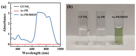 UV-vis spectra of G5.NH2, Ac-PR, and Ac-PR/IR820 dendrimers (a) and their corresponding photos (b).
