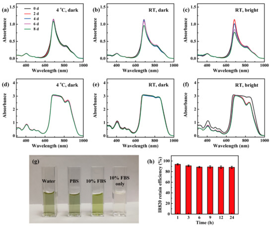 UV-vis spectra of free IR820 (a–c) and Ac-PR/IR820 (d–f) dendrimers when stored at distinct conditions; (g) the photo of Ac-PR/IR820 dendrimers dispersed in kinds of solvents; (h) the retain efficiency of Ac-PR dendrimers for IR820.