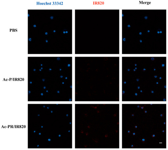 Confocal fluorescence images of U87MG cells after 6 h co-incubation with IR820-loaded dendrimers. Cells treated with PBS were tested as control. The fluorescence of Hoechst 33342 and IR820 were pseudo-labeled with blue and red, respectively. Scale bars: 20 μm.