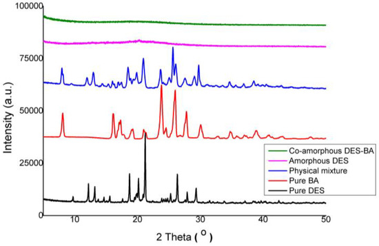 X-ray diffraction from DES and BA individually, the DES–BA (1:1) physical mixture, amorphized DES, and DES–BA (1:1) co-amorphous formation are presented in Figure 1. The sharp peaks of individual powders of DES and BA as well as physical mixtures of DES–BA, which showed the combined peaks of DES and BA, clearly indicate the shape of crystals. The physical mixture has a clear overlapping diffraction peak, which is the superposition of the two components. In contrast, the pure amorphous DES powder samples and a DES–BA mixture synthesized to co-amorphous form with the melt-quenching method resulted in a distinctive halo pattern with no diffraction peak showing the conversion of the crystalline form to an amorphous one. The loss of the crystal peak on XRPD can also be interpreted as the binary mixture of DES–BA prepared by the melt-quenching method being perfectly converted to a homogeneous co-amorphous form. However, other methods used to characterize the DES–BA co-amorphous system (1:1) is required to confirm co-amorphous occurrence.