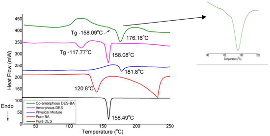 DSC thermogram from DES crystals, BA crystals, physical mixture of DES–BA, amorphous DES, and the DES–BA co-amorphous system are shown in Figure 2. Sharp endothermic peaks of DES crystal and BA at 158.49 °C and 120.8 °C, respectively, reflect the melting point of the crystal material. The endothermic peak of DES and BA in the physical mixture was 181.8 °C. Changes in the melting point of the physical mixture can be caused from the mediating of the two interacting compounds by the influence of DSC temperature during the process of the apparatus, the presence of melted BA, and acting as impurities in mixed systems or eutectic formation during DSC scans at high temperature. The DSC thermogram of the DES–BA co-amorphous system indicates the absence of an endothermic peak corresponding to the melting point of the DES and BA crystals, and is clearly distinct from individual crystal components and physical mixtures, indicating the formation of a new phase. This is also proved by the XRPD pattern, which suggested the formation of a DES–BA co-amorphous system.