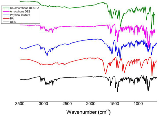 FTIR was used to confirm the possibility of molecular interactions between DES and BA in co-amorphous DES–BA. The entire spectra of DES crystals, BA crystals, physical mixtures of DES–BA, amorphous DES, and co-amorphous DES–BA are presented in Figure 3 depicting differences in vibrational transitions observed in the bands in the spectrum. DES and BA each showed specific spectra; after physically mixing DES and BA, the FTIR spectrum is a combination of both components, indicating no interaction between DES and BA after a simple mixing process. Meanwhile, DES crystals with amorphous DES did not show spectral changes, which indicate no structural change when DES became amorphous. On the other hand, the FTIR spectrum of the DES–BA co-amorphous system showed a different spectral peak. In the DES–BA co-amorphous system, some characteristics of the FTIR absorption bands from 1000 to 1800 cm−1 for co-amorphous formation were evaluated, since major differences in the spectrum are observed in the region. Co-amorphous DES–BA was shown by the characteristic appearance of the bands of carboxylic acids at 1650–1550 cm−1, signifying salt formation. The formation of DES–BA co-amorphous salts was reinforced with a different FTIR pattern with DES. DES–BA co-amorphous salt molecules were characterized by stretching C=O from a group of carboxylic acids of BA at 1686.82 cm−1 that were not found, replaced by the band characteristics of the carboxylic acid salts at 1594.23 cm−1 and 1552.76 cm−1. In BA, the neutral carboxylic group (–COOH) had a strong carbonyl (C=O) with stretching at a peak of 1686.82 cm−1 and a weak carbonyl (C–O) stretching at 1291.40 cm−1. If deprotonation occurs during DES–BA co-amorphous salt formation, the carboxylic anion (–COO−) has only a single stretch (C–O) at 1379.16 cm−1. The formation of DES–BA co-amorphous salts showed the intermolecular interaction in the compound. Interaction can be identified by the change of vibration frequency of the functional group. The presence and shifting of specific functional groups of DES and BA as well as the formation of co-amorphous salts indicated an interaction between DES and BA, which ultimately slows the recrystallization process. The peak shift of the spectrum for the carbonyl functional group indicated its participation in ionic bonds in salt formation [42].