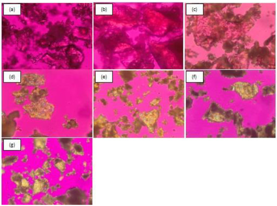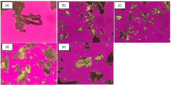 The process of recrystallization of amorphous condition can be observed after storage at 0, 3, 8, 17, 30, 45, and 90 days for co-amorphous DES–BA, and at 0, 2, 7, 15, and 30 days for amorphous DES. Observation of crystal habits was performed under a polarized microscope equipped with a digital camera. PLM is a method that can indicate the formation of new crystals. Figure 4 and Figure 5 illustrate the observations of the recrystallization of co-amorphous DES–BA and amorphous DES, respectively. Figure 4a–c do not show crystal growth; small crystals began to appear on the seventeenth day (Figure 4d). There was more growth over time, which can be observed in Figure 4e–g, and on the ninetieth day (Figure 4g), perfectly formed crystals could be seen. Meanwhile, Figure 5a shows the observation of amorphous DES only on day 0 and crystals beginning to form on the second and subsequent days (Figure 5b–e); on the fifteenth day (Figure 5d), perfect crystals had formed.
