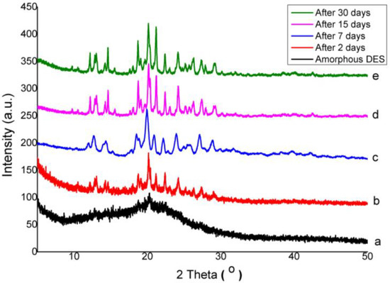 PXRD patterns of pure amorphous desloratadine (DES) for stability studies after storing at 40 °C under 75% RH and measured after specified periods of time: fresh prepared (a), 2 days (b), 7 days (c), 15 days (d), and 30 days (e).