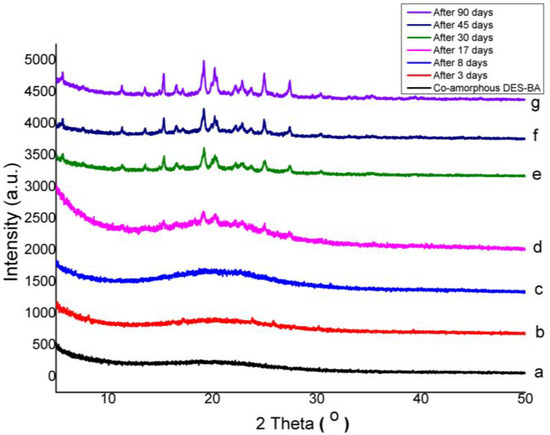 PXRD patterns of co-amorphous desloratadine-benzoic acid (DES–BA) system for stability studies after storing at 40 °C under 75% RH and measured after specified periods of time: fresh prepared (a), 3 days (b), 8 days (c), 17 days (d), 30 days (e), 45 days (f) and 90 days (g).