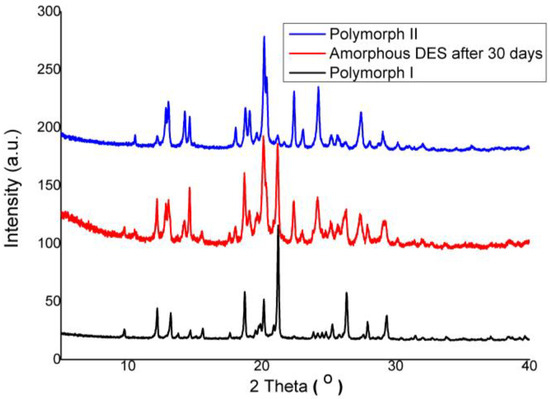 However, the new crystalline DES that was formed was in contrast to the early crystalline form, which appeared to form a new polymorph after amorphization; the DES changed to a mixture of polymorph I and polymorph II form from polymorph I, which is shown in Figure 8. Meanwhile, the PXRD pattern of the DES–BA co-amorphous system (1:1), as depicted in Figure 7, showed a small diffraction peak that appeared after 17 days. Observations of the previous days showed no specific diffraction peak of the observed crystal reflection, and only the halo pattern was observed. This suggests that the physical stability of the DES–BA co-amorphous system (1:1) is better than that of amorphous DES; however, on day 30, the DES–BA co-amorphous system (1:1) had formed a large diffraction peak, which indicated full conversion to crystalline form. The DES–BA co-amorphous system (1:1) exhibited better physical stability. This stability factor may be due to the higher Tg of the DES–BA co-amorphous system compared to amorphous DES. There is a certain correlation between Tg and the physical stability of the amorphous system, in which higher Tg means higher stability. Another factor of molecular interaction is also known to play an important role in preventing recrystallization of amorphous system, resulting in a single-phase amorphous system, shown by a single Tg observed in DSC measurements. According to FTIR, it was certain that the intermolecular ionic interactions between DES and BA were present in the DES–BA co-amorphous system. The last factor, miscibility, is another prominent parameter for amorphous stabilization [43]. DES and BA were molecularly well mixed when heating with melt-quenching, which formed a homogeneous co-amorphous system in the DES–BA co-amorphous system (1:1). In a homogeneous co-amorphous system, BA acts as a recrystallization inhibitor for DES, the interaction between DES and BA inhibits the occurrence of nucleation and crystal growth and prevents the recrystallization of DES.