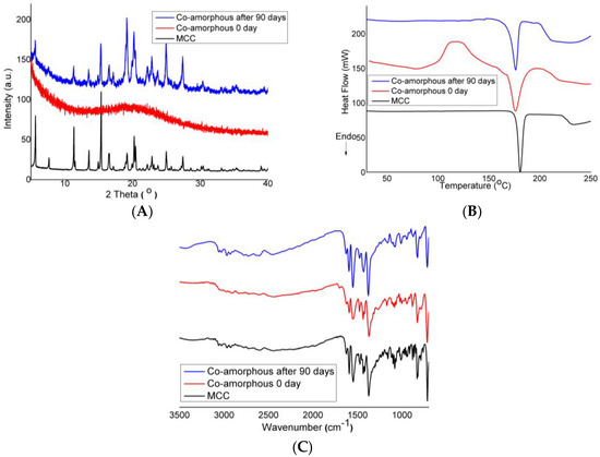 (A) PXRD diffractograms, (B) DSC thermograms and (C) FTIR spectra for multicomponent crystal (MCC) DES–BA (black line), co-amorphous DES–BA 0 day (red line), and co-amorphous DES–BA after 90 day (blue line).