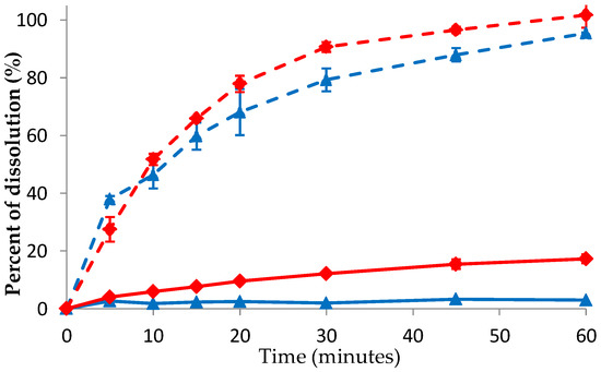 Powder dissolution profiles of pure crystalline desloratadine (DES) (blue) and co-amorphous DES–BA systems (red) in water (solid lines) and 0.1 N HCl (dashed lines) dissolution media at 37 °C.