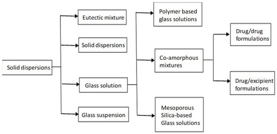 Solid dispersion (SD) was defined as the “dispersion of one or more active substances in an inert carrier prepared by melting, dissolution or melting-dissolution” [7]. They can be classified according to the solid phase and physical state as eutectic mixtures, solid solutions, glass solutions and glass suspensions (Figure 1). Glass solutions are single-phase amorphous systems. They are considered as supersaturated drug delivery systems, capable of maintaining elevated supersaturation drug levels in the gastrointestinal fluids thus, increasing absorption rate and bioavailability [8]. Amorphous SDs are further divided into polymeric and non-polymeric according to the stabilizers used [9].