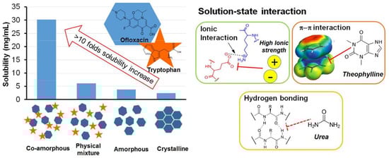 - Zhu et al. [22] studied Tryptophan—ofloxacin at a 1:1 weight ratio. XRPD showed complete co-amorphization and DSC showed an elevated Tg compared with the theoretical value. FTIR revealed that hydrogen bonding and π−π stacking were possibly involved in the formation of co-amorphous system.
