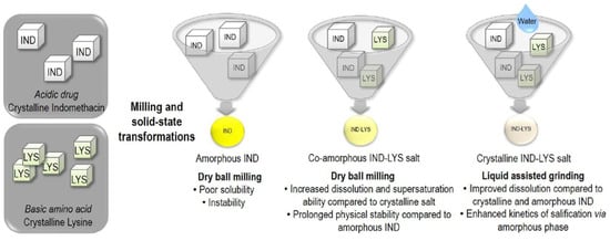- Kasten et al. [48] prepared different physical forms of salts of indomethacin (IND) with the amino acid lysine (LYS). XRPD, FTIR and DSC showed that dry ball milling led to the formation of a fully co-amorphous salt with a single glass transition temperature (Tg), while liquid-assisted grinding resulted in a crystalline salt while a new melting point (223 °C).