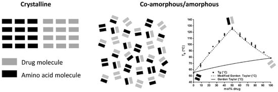 In these systems, amino acids (AAs) are used as biocompatible co-formers and act as anti-plasticizers by increasing the Tg, while blocking drug-drug interactions, delaying recrystallization. Due to the low MW, only small amounts are required compared with polymeric SDs [19,41]. Selection of AAs is based on knowledge of possible drug-receptor interactions at biological binding sites [41,42]. Improved dissolution rate and physical stability of co-amorphous drug-AA systems compared to the amorphous drug have been reported, due to molecular interaction [17,21,41,42]. However, stable systems with non-interacting components are also possible [24].