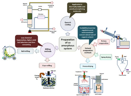 The preparation techniques of amorphous systems are presented in Figure 11. Unfortunately, hot-melt-extrusion was not included but this method is described later in Section 5.6. They can be classified into melting (e.g., hot-melt extrusion), solvent (e.g., solvent evaporation, freeze drying, spray drying) and techniques involving mechanical activation (e.g., milling) [81]. Furthermore, they can be divided into thermodynamic and kinetic. The former has as starting point a thermodynamically stable non-crystalline form, i.e., the drug in melt or in solution and co-amorphous is obtained by quenching or precipitation respectively. The kinetic pathway involves direct conversion of the solid crystalline into its amorphous state. This is possible during milling due to the continuous introduction of crystalline defects and disturbances through shearing, crushing and impact, and the overall mechanical activation. Selection of the preparation method depends on the thermal stability, melting temperature and the crystallization tendency of the drug and excipients, and it is very important for the quality and stability of the amorphous product.