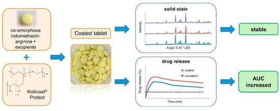 - Petry, I.; Löbmann, K.; Grohganz, H.; Rades, T.; Leopold, C.S. Solid state properties and drug release behavior of co-amorphous indomethacin-arginine tablets coated with Kollicoat® Protect. Eur. J. Pharm. Biopharm. 2017, 119, 150–160. [Google Scholar] [CrossRef] [PubMed]