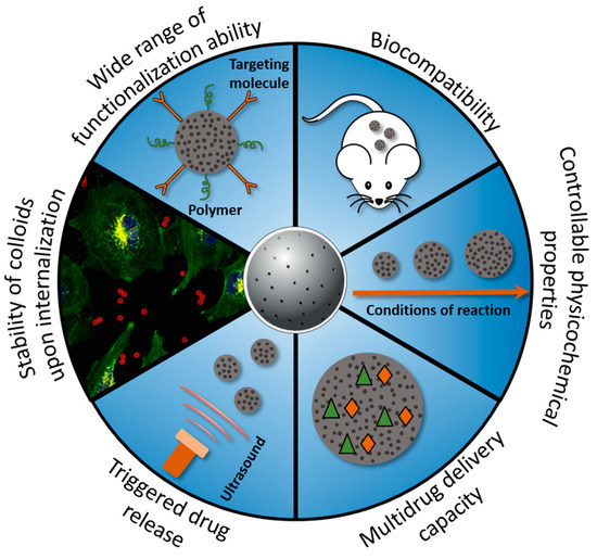 Nanoscale materials attract a significant interest in the industrial and research communities. These smart functional materials, which are made up of diverse components, offer tremendous opportunities in the field of biomedical applications, especially, in cancer therapy [1,2]. The development of porous materials for the cancer research is mainly determined by the unique ability to control physico-chemical characteristics and properties of these materials [3,4]. At the same time, controllable properties allow to design multifunctional materials, enabling bioimaging, sensing, as well as their therapeutic applications [5]. The porous nano-/microparticles are considered to be the most appropriate carriers for the drug delivery. Among them, silica, calcium carbonate and calcium phosphate are promising vehicles [6,7,8]. These particles are able to transport the huge loads of anticancer or therapeutic bioactive molecules to the desired sites for the disease treatments, owning higher efficiency and lower side effects compared to the individual drugs [9]. The drug carriers based on silica, calcium carbonate and calcium phosphate nano-/microparticles possess several advantages such as improved pharmacokinetic profile, possibility to employ lipophilic drugs, higher circulation time in comparison to the administration of the free drugs and lower overall toxicity due to the lower dosages used [10]. A broad range of the pore sizes (2–50 nm) of porous carriers allows loading of therapeutic agents of different nature, such as low-molecular weight drugs, proteins, genetic materials (plasmid deoxyribonucleic acids (DNA), ribonucleic acids (RNA)). The available surface area and pore networks provide possibility to incorporate even inorganic nanoparticles (for example, iron oxide, gold, silver nanoparticles, quantum dots, etc.) [11,12,13]. The inclusion of the inorganic nanoparticles into the porous structure of the carriers leads to the formation of hybrid materials. These materials combine the properties of both components of the hybrid system (porous carriers and inorganic nanoparticles) [10]. The progress in this field includes the fabrication of porous micro- and nanocarriers modified with, for example, magnetic nanoparticles, what enables the sensitivity of the carriers to the external magnetic field [14]. Combination of various properties in one intelligent carrier provides their multifunctionality for the potential use in the medical diagnostic and cancer therapy. These include in vivo tracking of drug vehicles using magnetic resonance imaging (MRI), application of various field-dependent magnetic behaviors to reach greater concentrations of functionalized drug-particulate systems in the desired areas in vivo. The multifunctional properties can be also achieved when incorporating gold nanoparticles or quantum dots into the porous structure. As known, the coupling of the strong near-infrared plasmon resonance absorption of gold nanoparticles into the thermal energy is an example of a nanoscale phenomenon that has been widely exploited to photothermally destroy malignant tumors. As a result, the gold-functionalized porous carriers are able to deliver antitumor drugs into cancer cells and simultaneously deliberate photothermal properties [15,16]. In addition, the impregnation of inorganic nanoparticles that are intrinsically responsive to different kinds of stimuli allows to form multi-stimuli responsive drug carriers [17]. Employing different types of stimuli (internal or external), a rapid or prolonged release profile can be achieved suggesting multiple drug regimens to improve clinical success [18,19]. Particularly, the multi-functionalized carriers combining two or more stimuli-responsive mechanisms hold greater potential for controlling drug release process and improving therapeutic performance [20]. The surface of porous carriers can be easily functionalized by a variety of ligands such as antibodies, aptamers, bioactive polymers, and peptides for higher in vivo stability in the blood stream (e.g., using PEGylation to avoid macrophage capture, and/or adjusting active targeting properties for the carriers accumulation in the desired area) [21]. Moreover, the size of porous carriers can be tuned using different synthetic approaches. Varying the size and shape of the particles, it is possible to control the internalization process in different cell types [22,23]. In addition, silica, calcium carbonate and calcium phosphate-based carriers are biodegradable and can be safely excreted by the body through the kidney. Figure 1 schematically represents the main advantages of the employment of the porous carriers in the drug delivery applications.