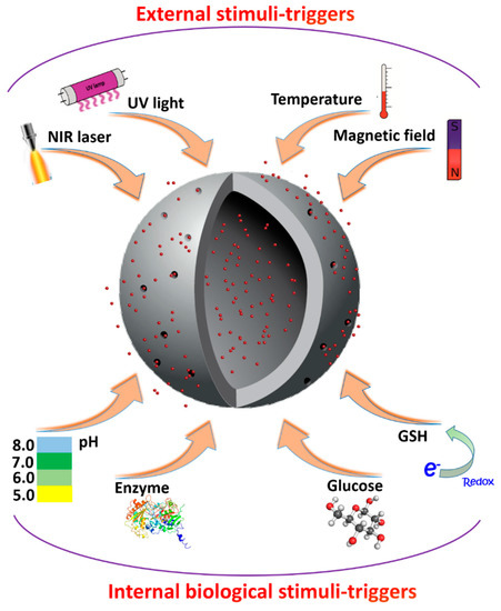 The mechanism of drug loading is closely connected with its release, thus the desired conditions of cargo release determine the coating method. Two distinct mechanisms of payload release can be distinguished: triggering from internal factors, in this case the release occurs when MSN environment reaches certain predetermined conditions, and triggering from external factors, when an outside influence is required for the release to occur (Figure 3). With an internal triggering, release conditions can be chosen close to the conditions inside or near cancerous cells, for example, to deliver chemotherapeutic drugs such as doxorubicin to their targets. With an external triggering, it is possible to select the area for the drug release by applying, for example, light or magnetic field locally.